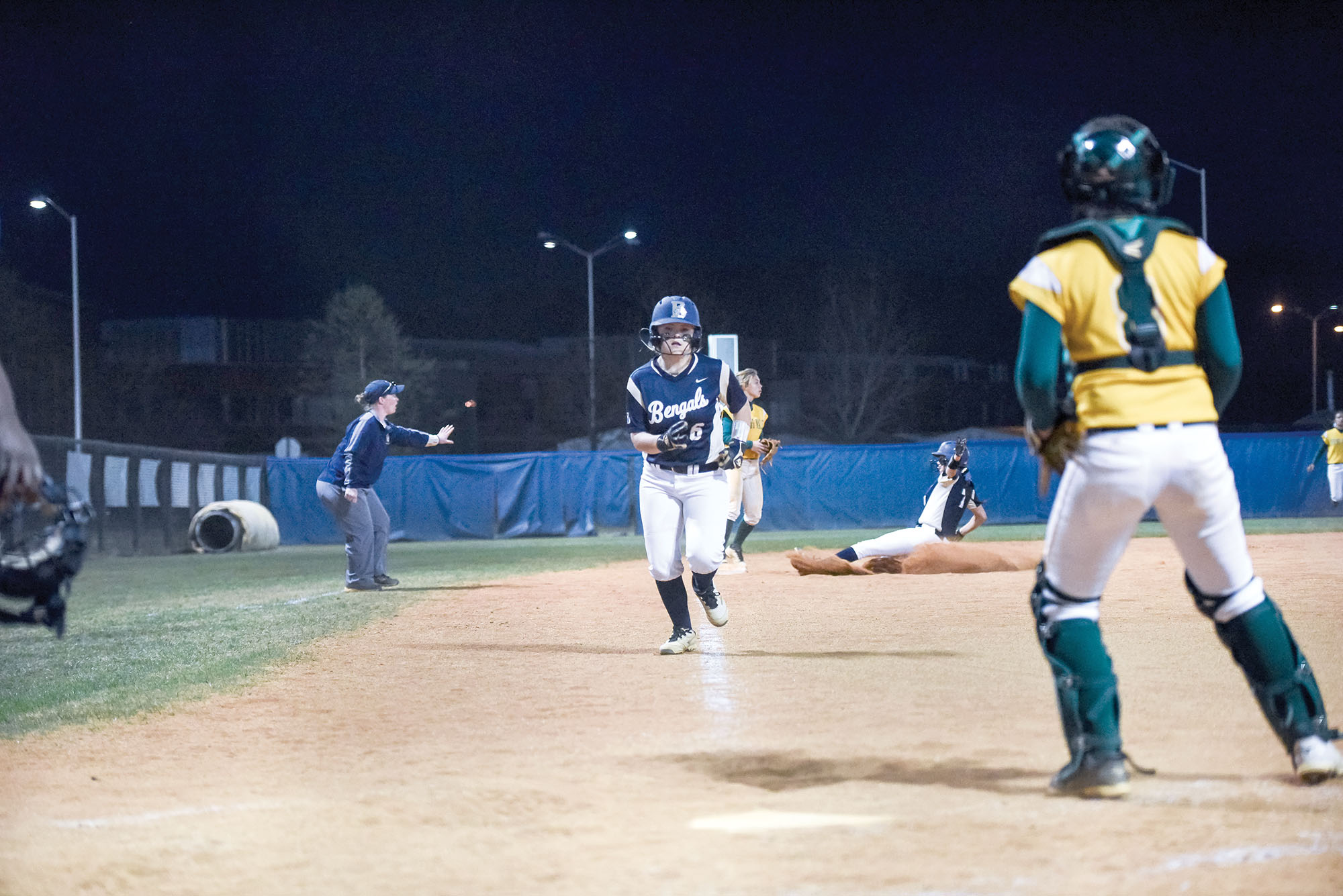 BLYTHEWOOD (March 23, 2016) — Kendall Parker (6) cruises home as Ashlee Romanick slides in safely at third Tuesday as the Lady Bengals squeaked past Spring Valley 6-5 at BHS. Now 3-0 in region play, the Lady Bengals are at Ridge View on March 24 at 7:15 p.m. and host Irmo at 5:30 p.m. on March 25.