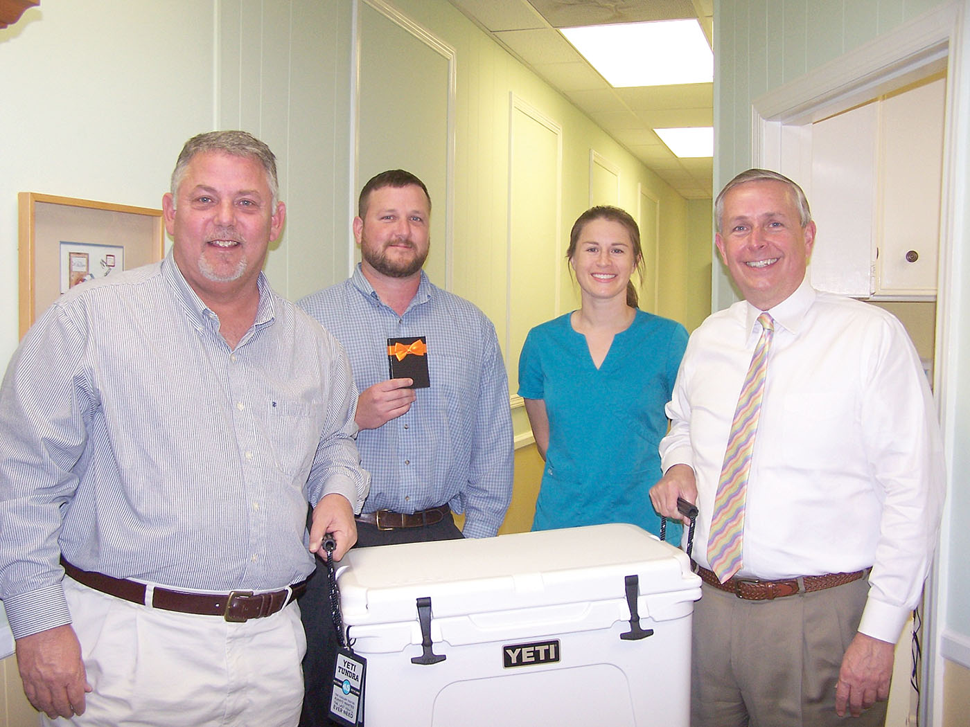The office of Drs. Philip Wilkins (right) and Reid Warren (second from right) in Winnsboro sponsored an annual March Madness bracket challenge. Tied for first place were Bill Stidham (left) of Winnsboro and Martin Timms (second from left) of Ridgeway. A coin flip determined that Bill Stidham won the first place prize of a 45-quart YETI cooler. The second place prize, a $200 Amazon gift card, was awarded to Martin Timms.