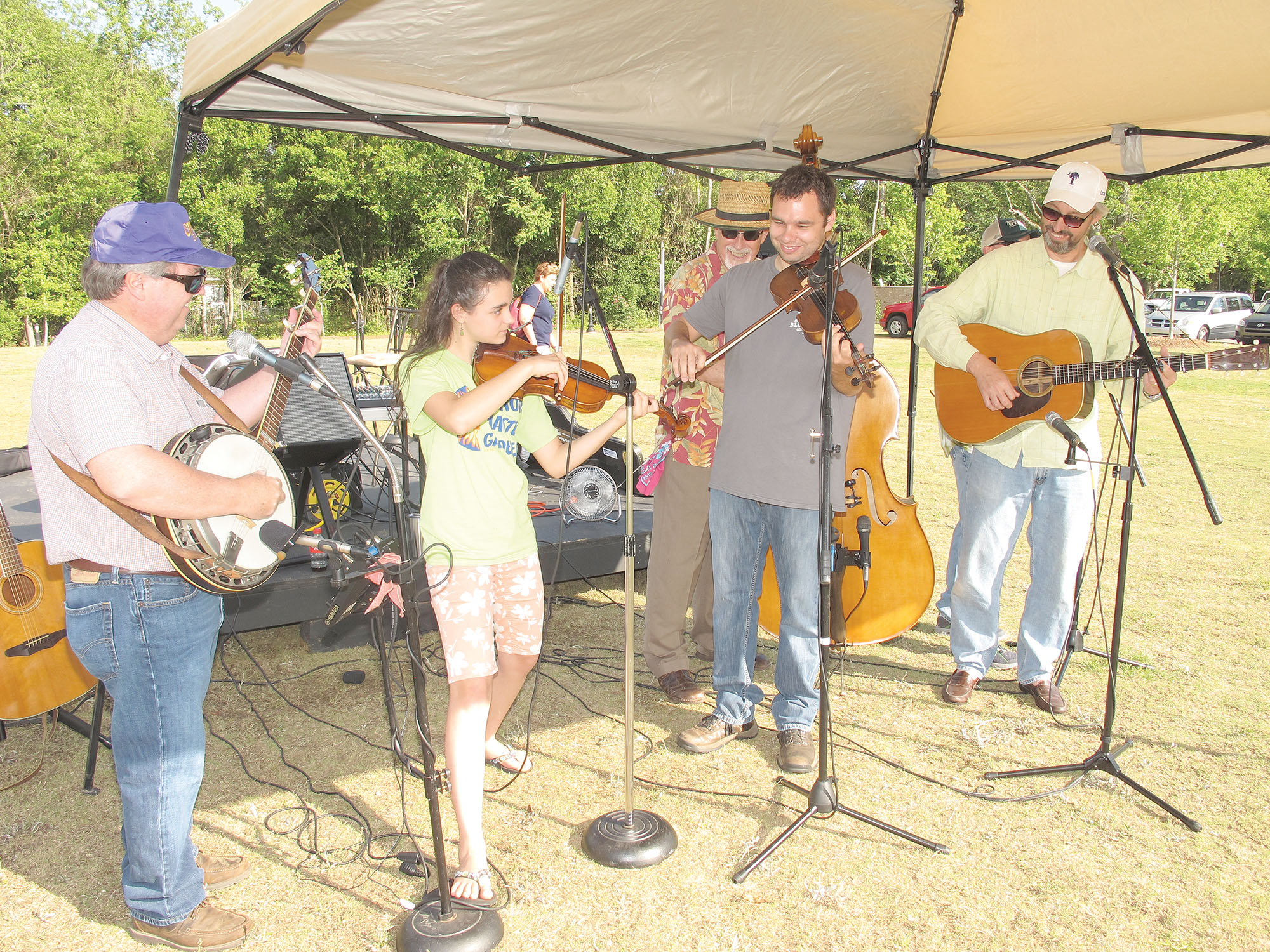 Fiddle players Haley King, 14, and James Graddick of Blythewood join members of the Columbia Blue Grass Band last week as they entertained for the opening day of the Blythewood Farmers Market in Doko Park. Haley placed third in the S.C. State 2015 Old Time Fiddling Championship, Junior Fiddle Division, last fall in Pickens County.