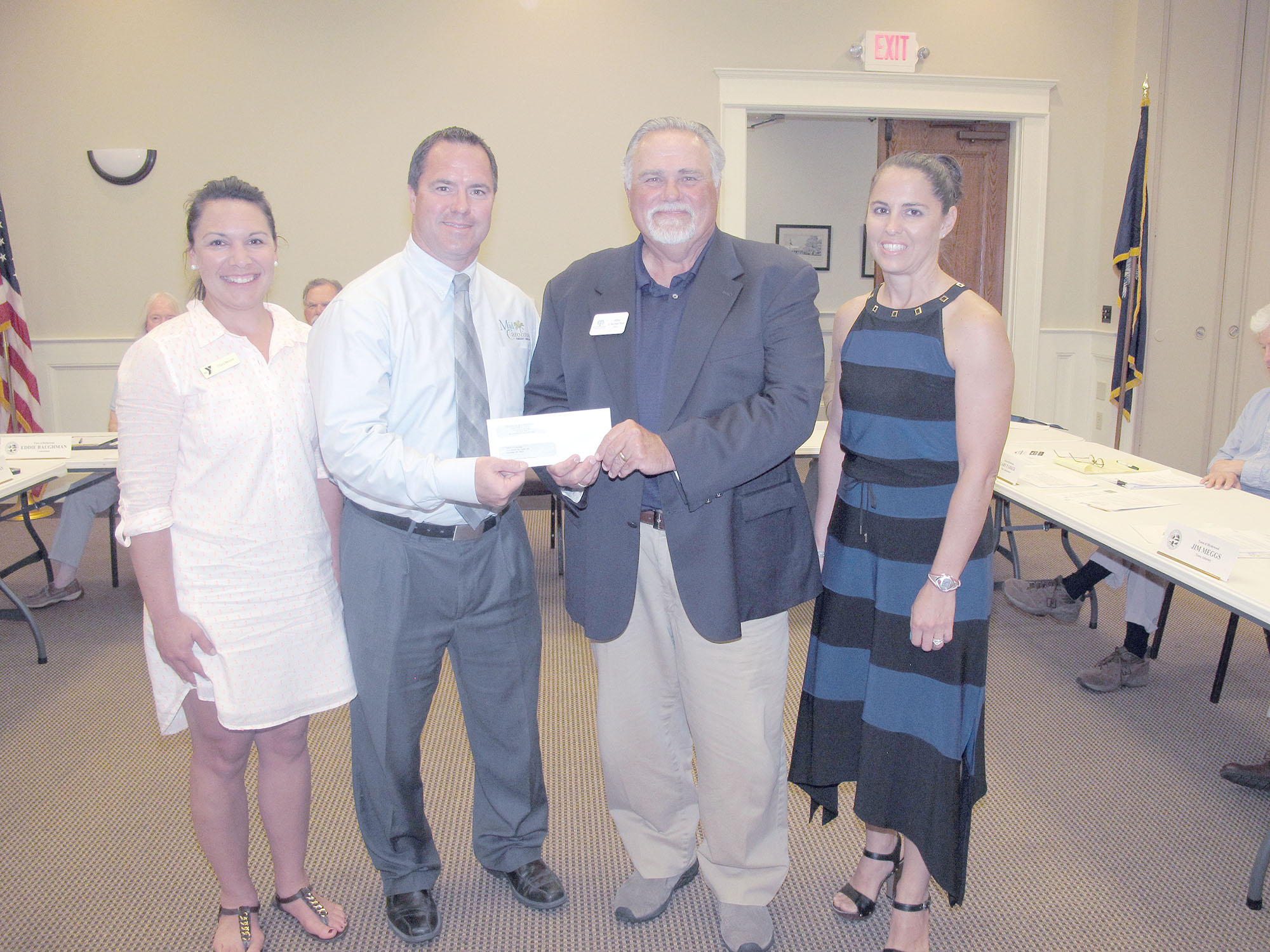 Mayor J. Michael Ross presented a check during the Monday evening Council meeting for $1,000 to Blythewood’s Jeep Rogers YMCA for its annual fundraising campaign. Accepting the donation are representatives of the YMCA, from left, Tiffani Moore, Brad Lewis (manager of the Blythewood office of Mid Carolina Credit Union) and Katie Litton.