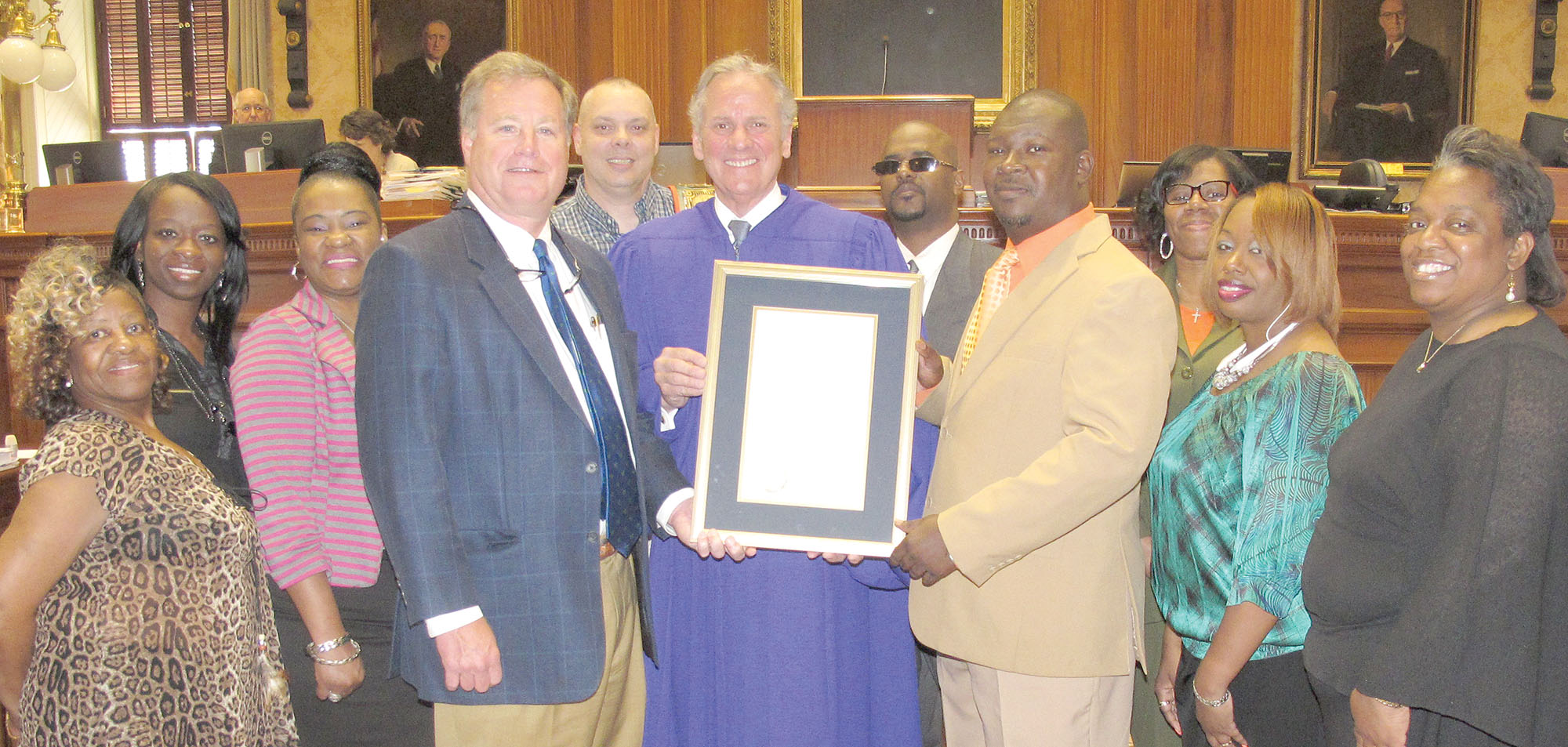Sen. Creighton Coleman and S.C. Lt. Governor Henry McMaster, center, presented a Senate proclamation last month to Darreyl Davis, president of Believers and Achievers, for the group’s work in support of youth in Fairfield County. From left are some of the organization’s members: Sallie Benson, Felicia Alexander, Annie White, Coleman, Raymond Fowler, McMaster, Keeon Watkins, Davis, Lekwan Rabb, Eliza Davis and Albertha Woodard.