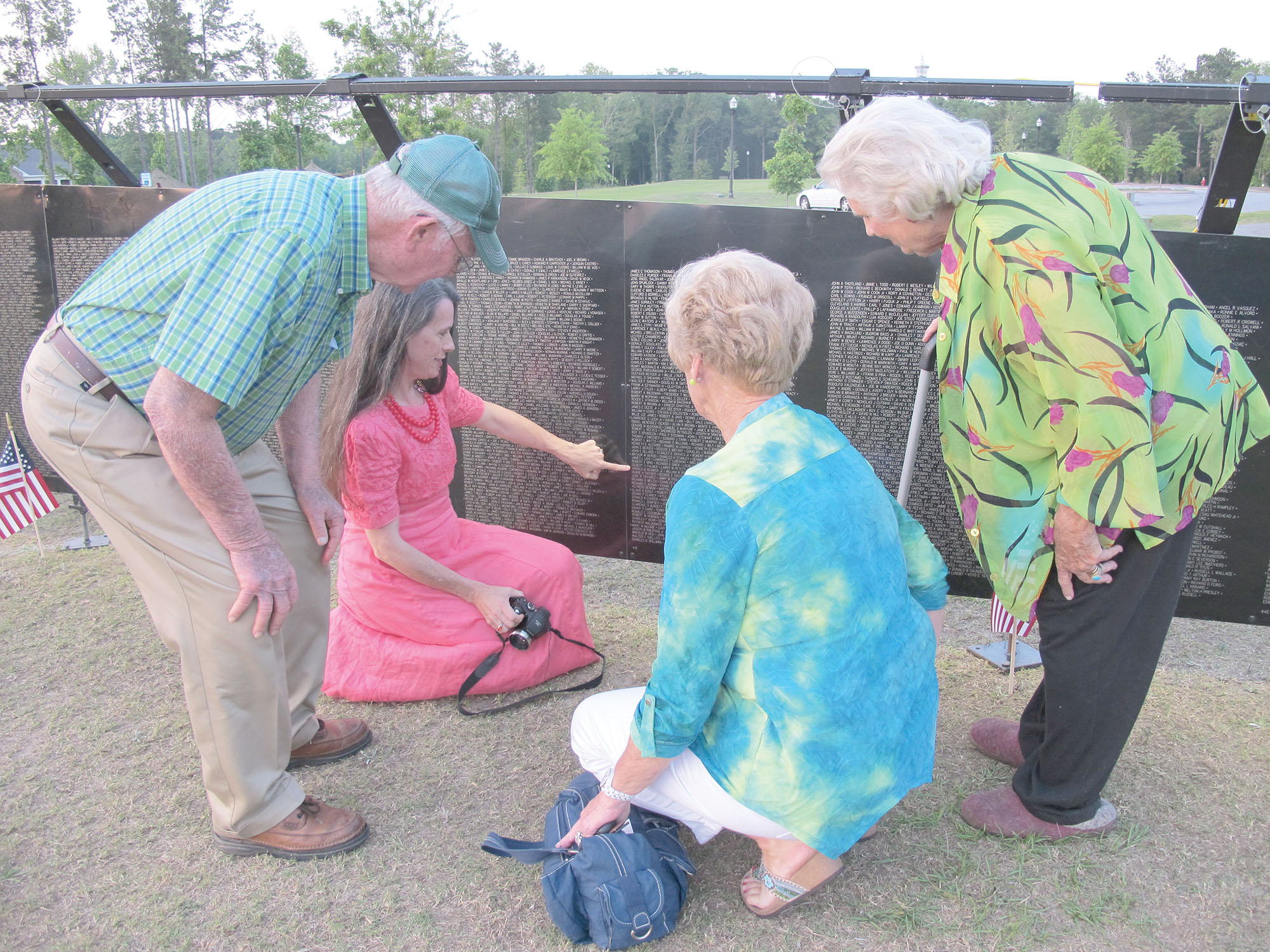 Penny Renwick of Winnsboro touches the name of her father, Harold McGill (Mac) Renwick Jr., engraved on The Wall that Heals, a half-size replica of the Vietnam War Memorial that was displayed in Doko Park in Blythewood over the Memorial Day weekend. Renwick Jr. was killed in Vietnam on Feb. 28, 1967, when his daughter was 22 months old. Visiting the Wall with her daughter are Renwick Jr.’s widow, Perry-Anne Renwick, right, and Bobby and Ann Pope, all of Winnsboro.