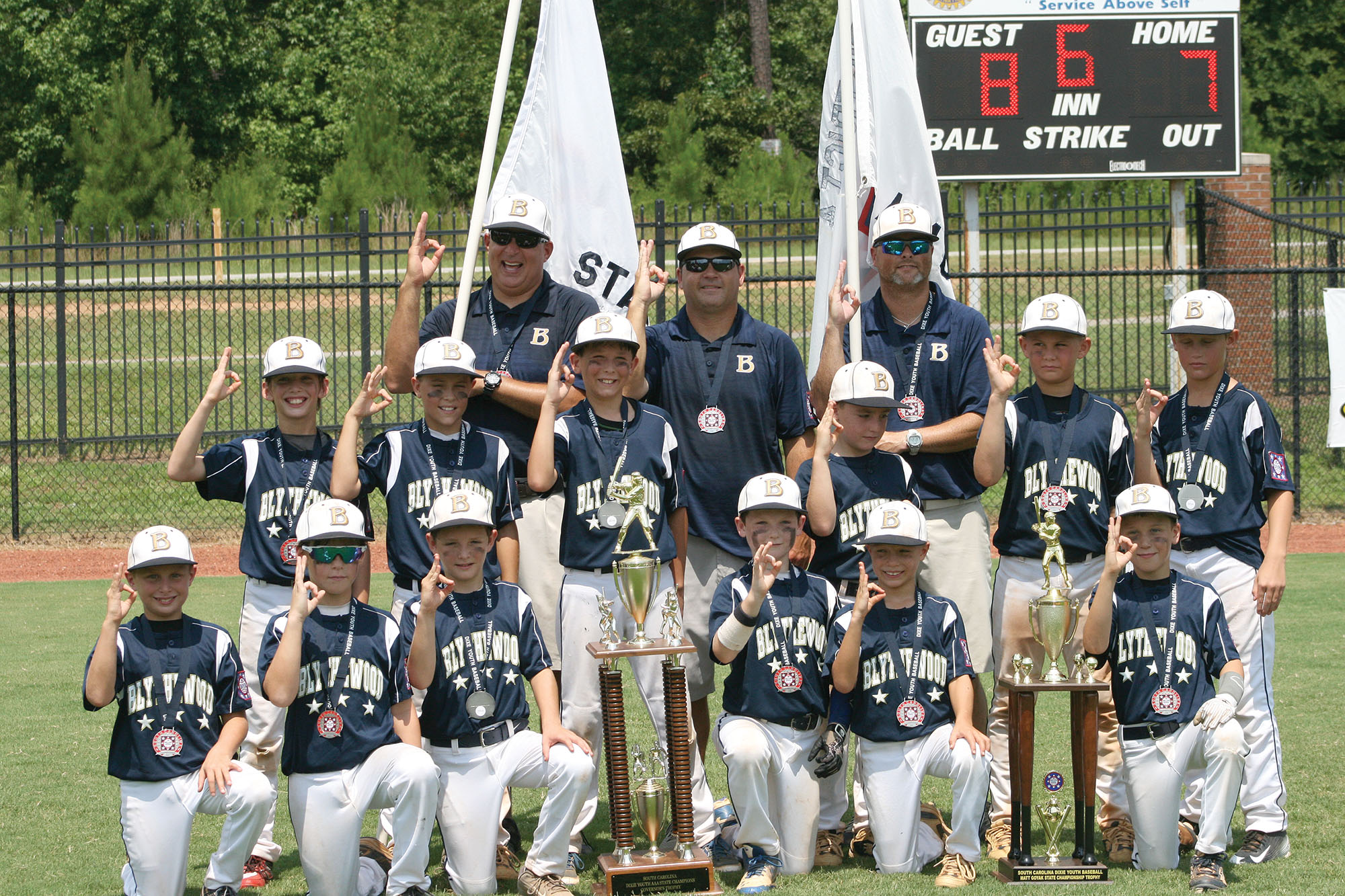 The Blythewood Minors 9- and 10-year old Dixie Youth Baseball team celebrate last week’s state title win. The team heads to Mississippi next week for the Little League World Series. Front: Landon Smith, Landon Penfield,Evan Todd, Alex Myers, Jackson Bottar and Sammy Franklin; middle: Miller Stuck, John Rollings,Jeb Britt, Ryan Watts, Harrison Collins and Jack Sanderson; back: coaches Ken Britt, Buzzy Myers and Les Penfield.