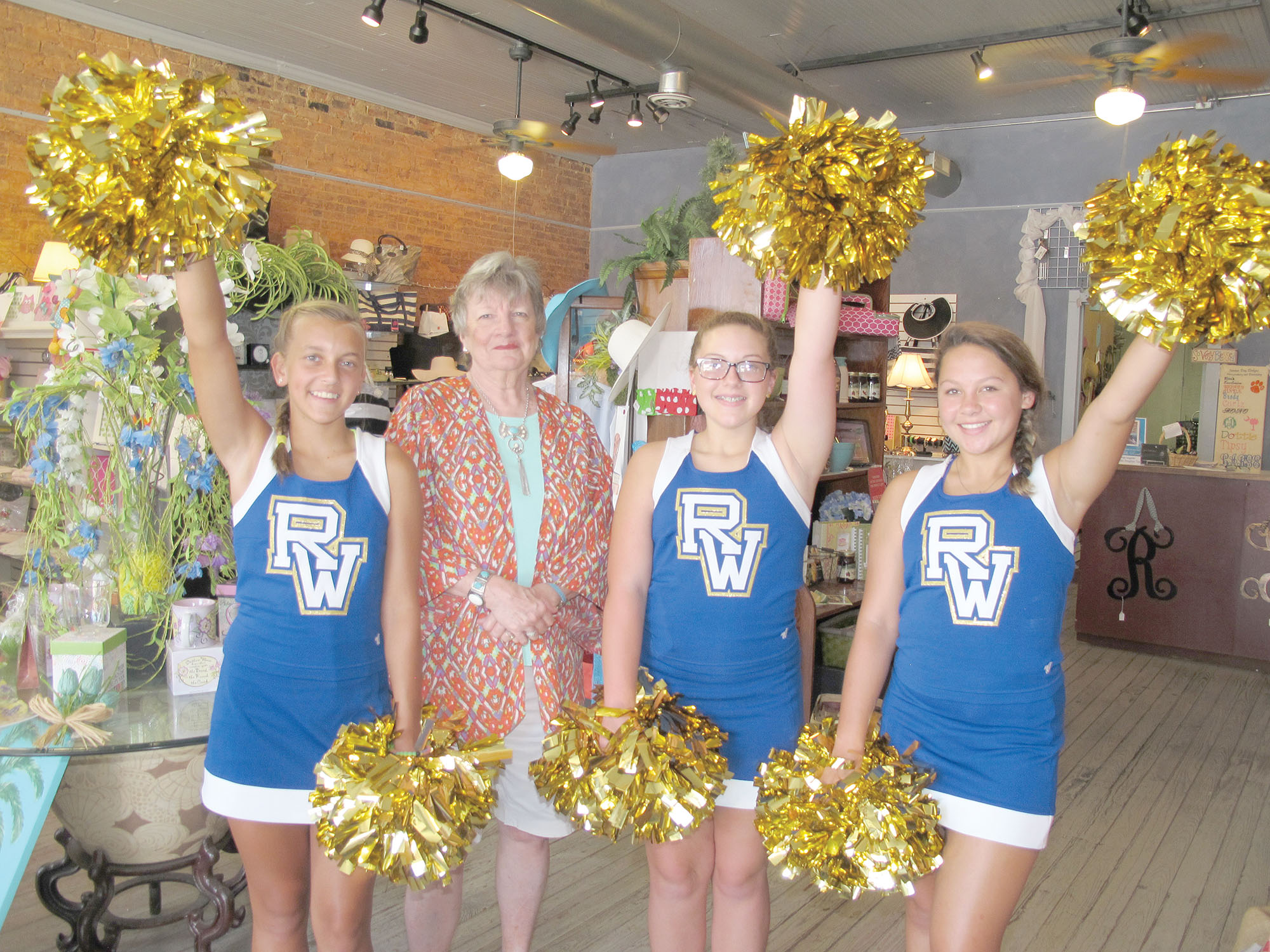 Richard Winn Academy eighth-grade cheerleaders Anna Mathias, Blythe Edwards and Emma Castles stopped in Summer Day gift shop in downtown Winnsboro last week to cheer on the shop’s owner, Kathy Timms, second from left. The students’ surprise visit was one of several efforts the students are making to support businesses and organizations in the community as part of the school’s new Eagle Care Program whereby RWA students offer their services for community projects. “It is our students’ way of giving back to the community,” said the new Head of School, Brandy Mullennax. “And, along with giving back and offering a helping hand, they will learn about the different businesses, organizations and entrepreneurial opportunities that are in our community.” For information about the program, call 635-5494.