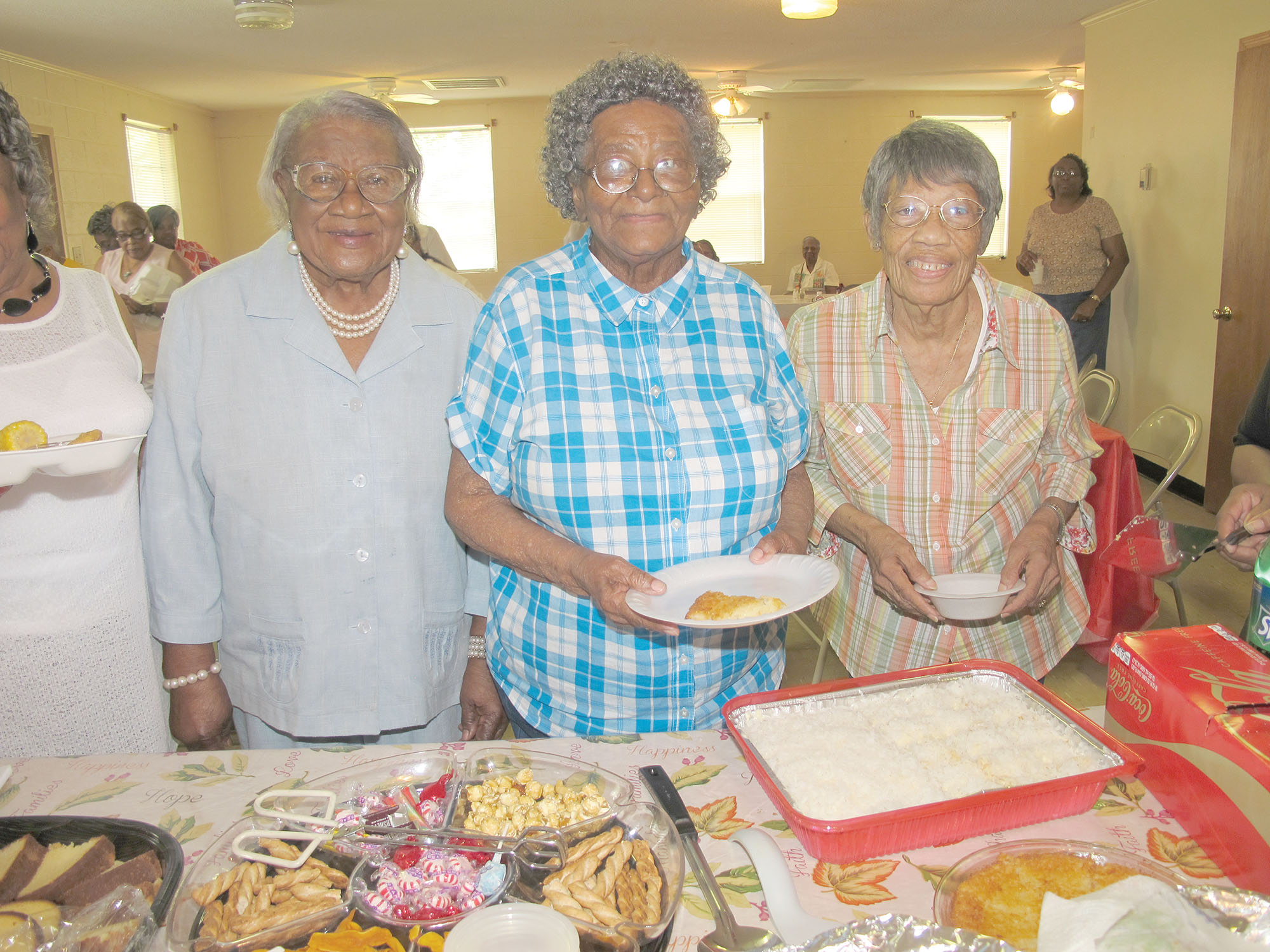 Maxine Canzater, Francis Mitchell and Naomi Waden line up at the dessert table during the Blythewood Ladies’ Club annual summer picnic last week. At 94 years old, the women proudly share the distinction of being the oldest members of the group. Waden, who baked two coconut custard pies for the occasion, even boasts of not having to take any medications – at all!