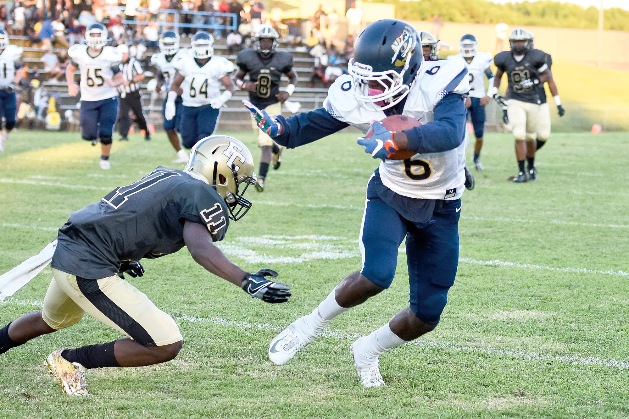 Blythewood’s Kameron Riley (6) slips the tackle attempt by Quay McBride (11) and takes Jordyn Adams’ pass in for the score. (Photo/Kristy Kimball Massey)