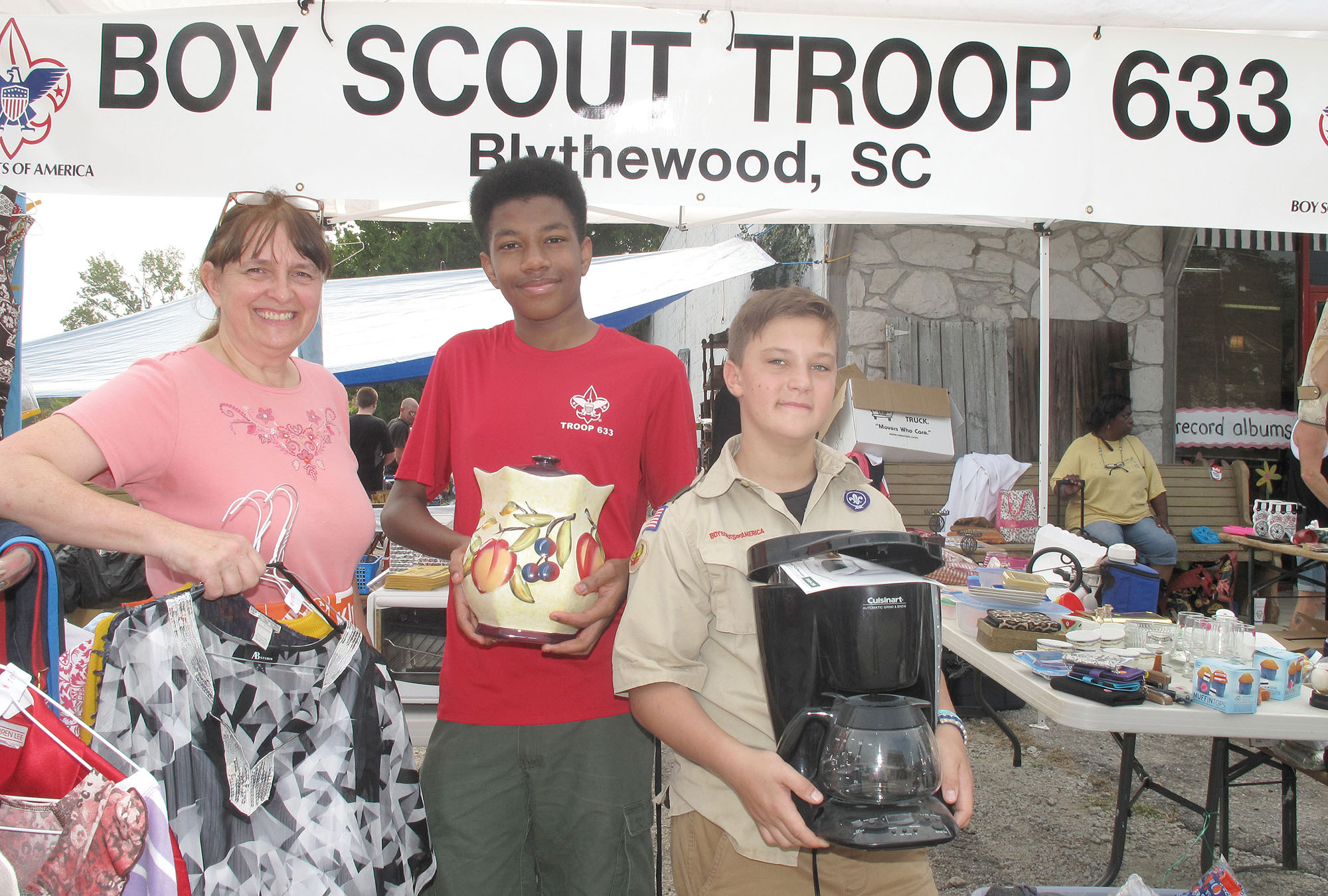 Scout Mom Liz White and Troop 366 Boy Scouts Anthony Mitchell and Daniel White stake out territory at last weekend’s Big Grab in front of Blythewood Consignment to sell merchandise to benefit the Troop.