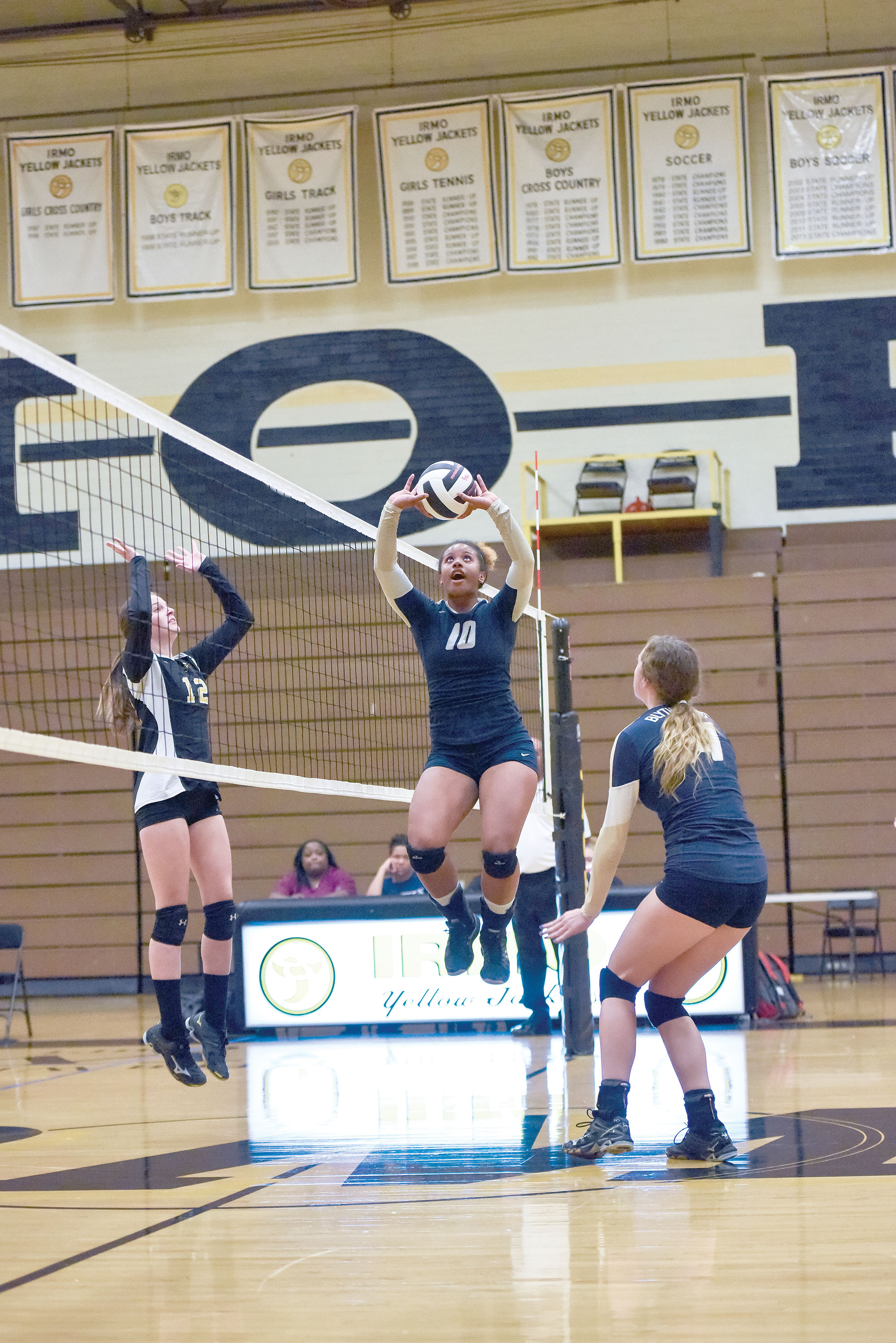 Chania Rispress (10) sets things up for Isabella Bell (14) Tuesday. The Lady Bengals beat Irmo in straight sets, 25-7, 25-10 and 25-12.