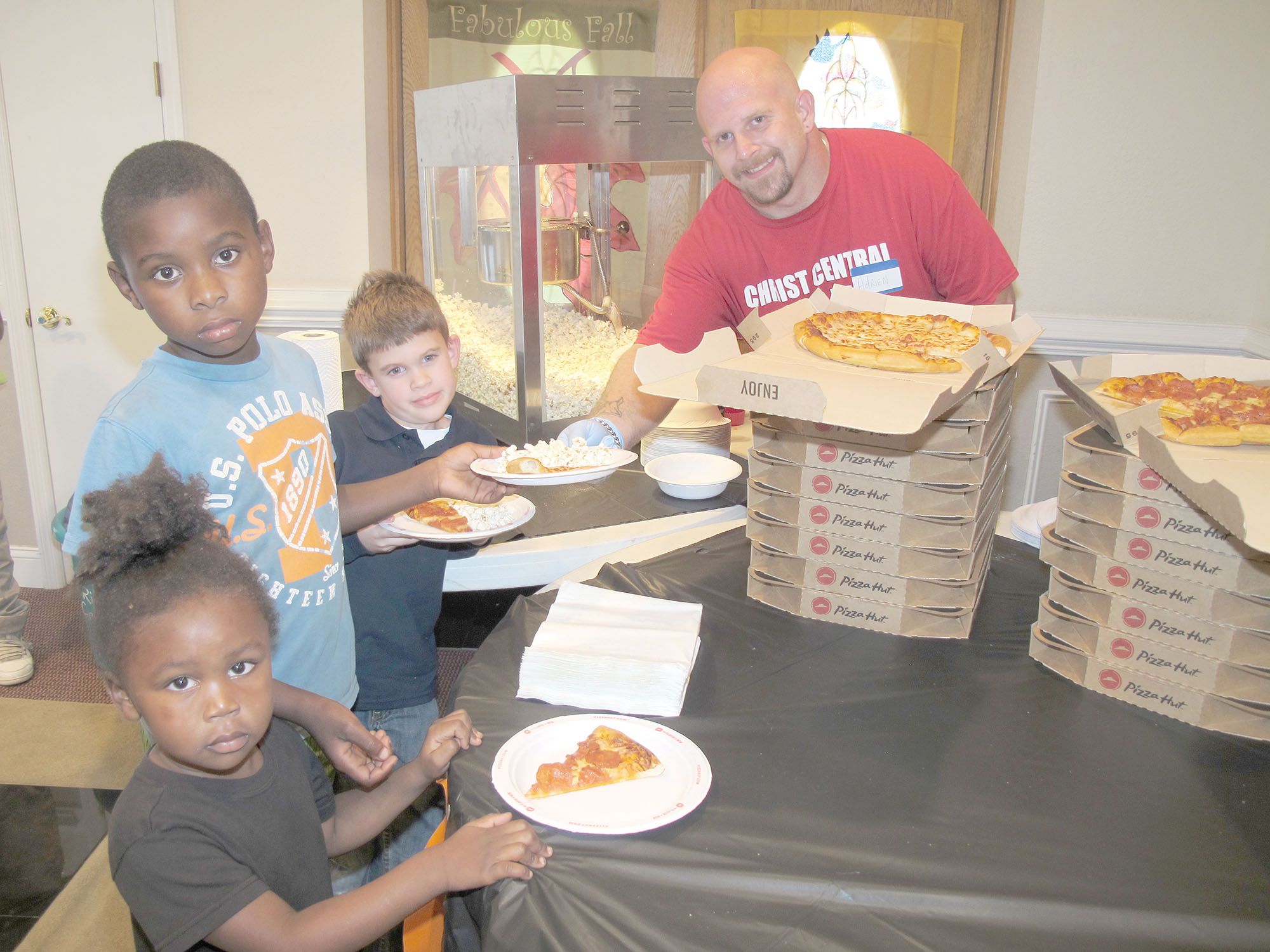 Adrian Pilot serves free popcorn and pizza to Zachery Combs, 7; NyDarius Boulware, 8; and NyQuan Robinson, 3, during a Friday evening Kids Fun Day sponsored by Christ Central Church in downtown Winnsboro. Wesley Welch, who conducted the program, said 60 children attended the event, which included games and prizes. The next Kids Day is scheduled for Friday, Nov. 5 from 5 – 7 p.m. at the Church, which is located at 135 S. Congaree St. in Winnsboro.