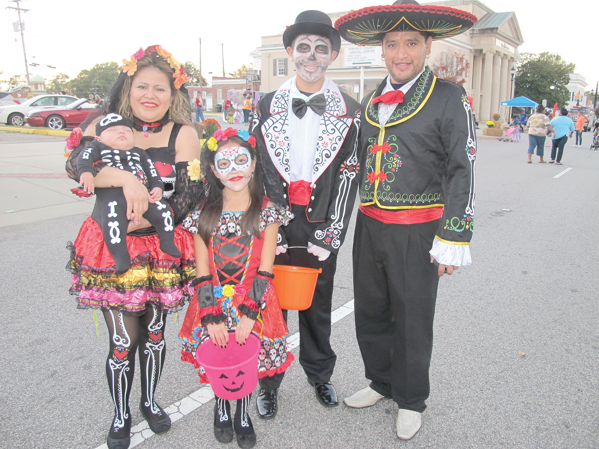 Three-month-old Sebastian Robles slept through the frightful fun as his colorfully costumed family, Alejandra Villegas (holding Sebastian); Abigail Robles, 8; Jose Robles, 13 and dad, Omar Robles enjoyed Pumpkin Fest in downtown Winnsboro Saturday evening.