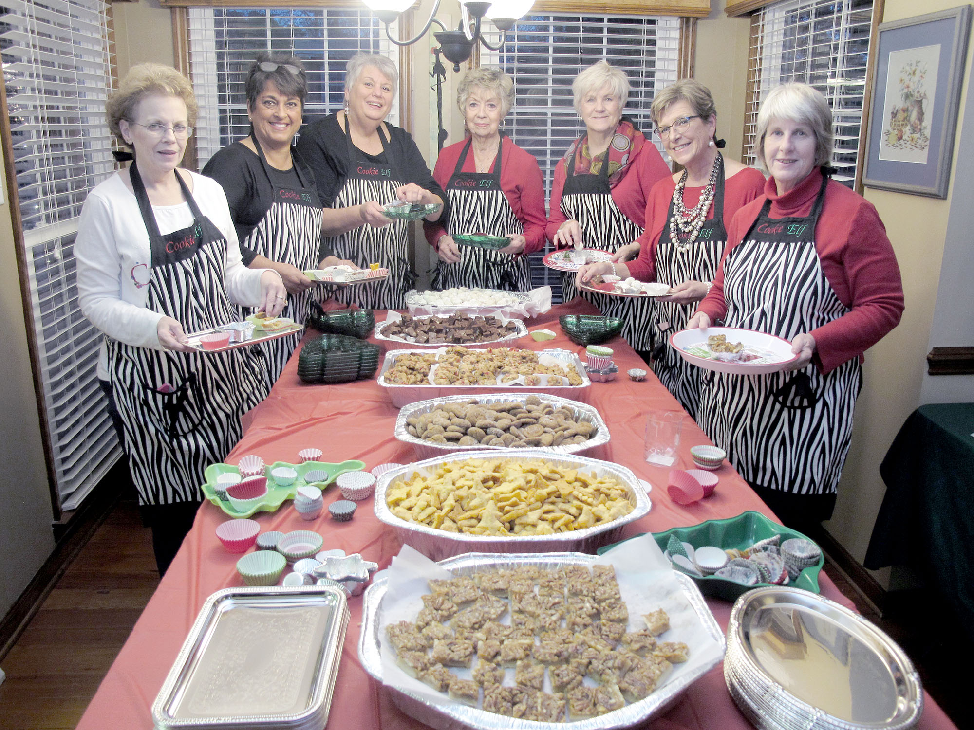 The Blythewood-Ridgeway-Winnsboro Cookie Elves were at it again this Christmas, preparing trays of homemade cookies for seniors and shut-ins in the three communities. In matching aprons, Elves Jan Gregory, Beth Collins, Norma Branham, Mitzi Davenport, Phyllis Gutierrez, Denise Jones (and others not shown) met the Sunday before Christmas at Branham’s home to fill 75 trays with goodies. Then, for the sixth year, the Elves and their assistants delivered holiday cheer and the trays of sweet treats during the week before Christmas.