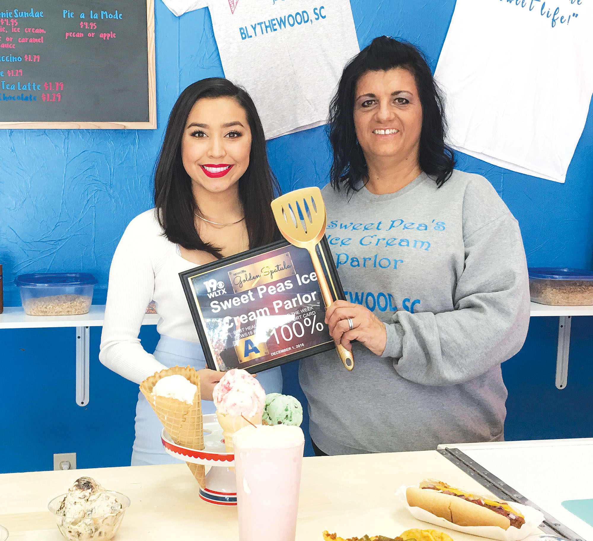 Sweet Pea’s Ice Cream Parlor opened in Blythewood in July and last week the store captured the coveted Golden Spatula Award and was featured on WLTX-TV. “We are thrilled!” said store owner Susan DeMarco (at right, with WLTX’s Sonia Gutierrez). “The award is presented to an eating establishment that has received a 100 percent rating on their Department of Health and Environmental Control inspection. And we won it!” While Sweet Pea’s is primarily an ice cream store – offering 25 flavors of the sweet treat, milk shakes and sundaes – it also serves hotdogs, homemade chili, nachos and soft pretzels as well as coffee, cappuccino, chai tea latte, homemade pies and muffins. Sweat Pea’s is located at 412 McNulty Road.