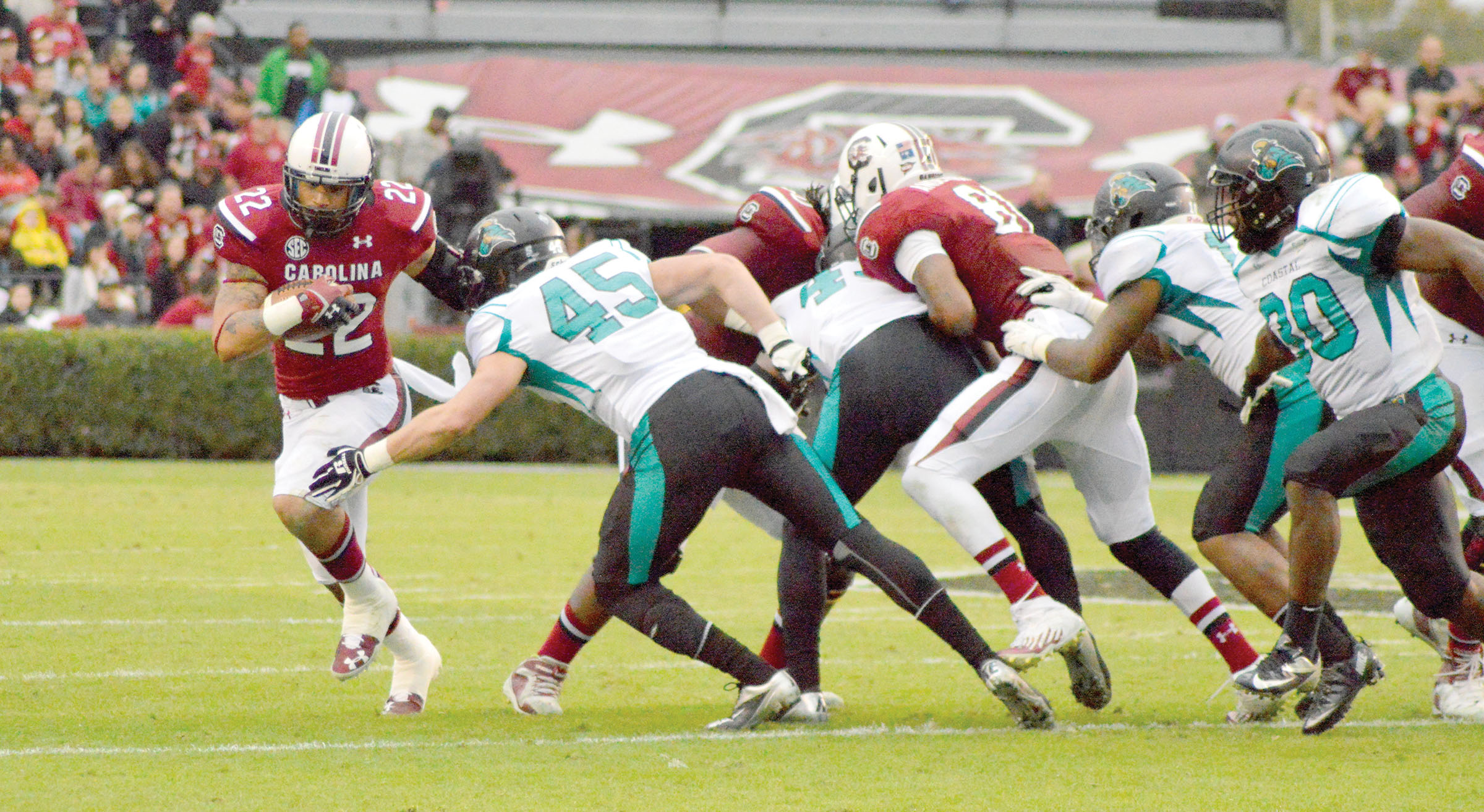 Former Bengal and Gamecock running back Brandon Wilds was called up last week to the N.Y. Jets. Wilds, 23, graduated from USC in December 2015 and signed with the Atlanta Falcons as an undrafted free agent last spring. He made it to the final roster cuts with the Falcons this preseason before catching on with the Jets’ practice squad. Wilds graduated from BHS in 2011 and while a Bengal racked up 2,700 yards and 29 rushing TDs. During his four years as a Gamecock, he rushed for 1,844 yards and 13 TDs. Above, Wilds breaks a tackle of Coastal Carolina DB Alex Scearce in USC action.