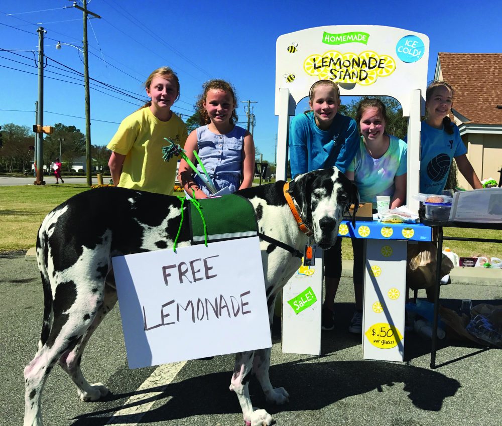 Eva Hoagland (left), Sophie Sweatman, Reese Peck, Anna Livermore and Kylie Patch, members of the Village Church 4th and 5th grade Sunday school class at the VillageChurch, offered free lemonade and cookies to the hundreds of people who shopped the Hoof & Paw yard sale on April 1 in the parking lot of Trinity United Methodist Church in Blythewood. Assisted by J.J., a Great Dane owned by Julie Monroe, the girls’ Sunday School teacher, the class also collected donations to benefit Fairfield County Adoption Center. Hoof & Paw President Deborah Richelle said the group raised over $4,000 from the very successful sale. “We’re very grateful,” Richelle said, ” for everyone who came out to help make it a success.”