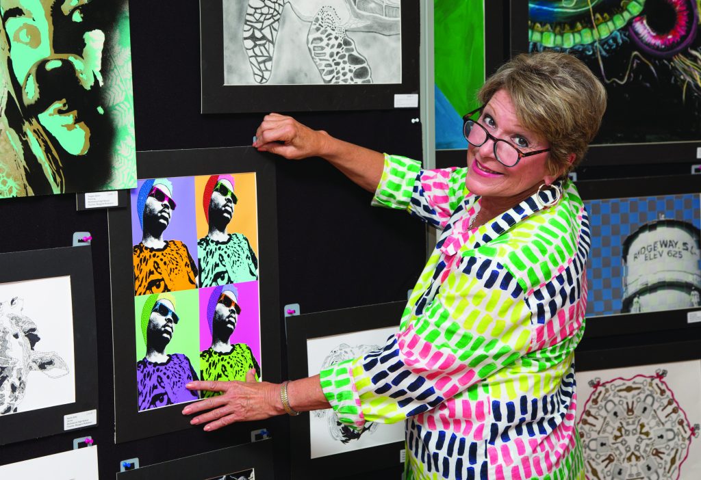 Phyllis Gutierrez, Chairwoman of the 2017 Arts on the Ridge festival, displays student art work entries from Blythewood High School exhibited on the second floor of the Century House. The two-day event kicks off Friday evening, May 5 at 6 p.m. with music, art and food. For more information see page 3.
