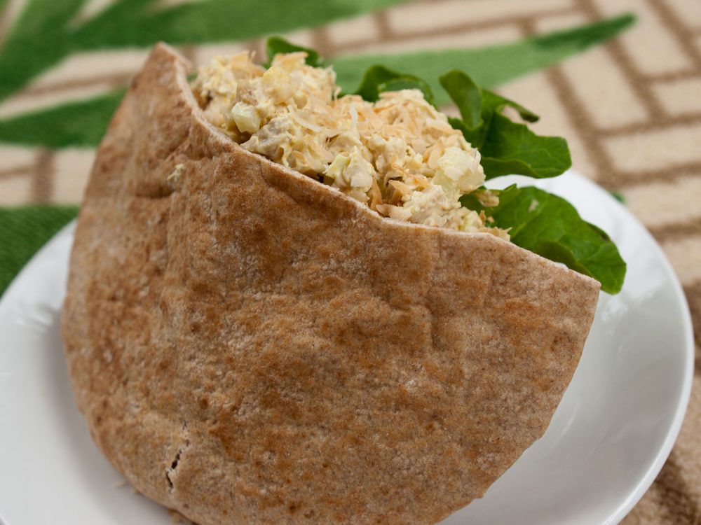 Tuck tropical flavored Rotisserie chicken Salad into a whole wheat pita for a delicious lunch on the lanai.