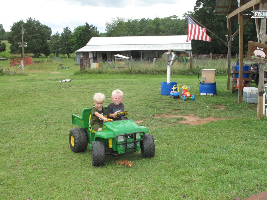 Jacob Rambo, 3, at the wheel of the pint-sized John Deere tractor, and sidekick Samuel Pope, 2, showed off their farming expertise during Ag + Art weekend. The boys were on site at Triple J Farm on Cammack Road where Samuel’s dad, Jason Pope, showed tourists around the farm. Artist Julie Rambo exhibited and sold her painted, recycled metal art work at the farm, and tourists purchased free-range eggs and homemade chocolate chip cookies.