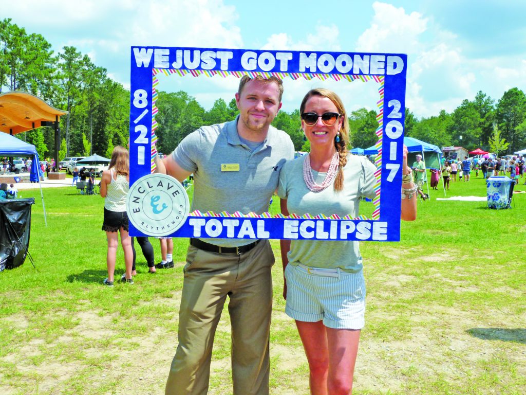 Andrew Fournier and Rayna Plowden promoting The Enclave Apartment Homes on Wilson Boulevard during Blythewood’s Eclipse the Park Monday.