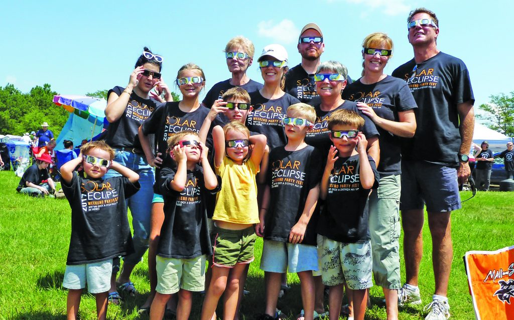 Blythewood residents Resa Cochran (pink hat) and husband Doug (far right) made the eclipse a family event for their grandchildren and other family and friends. – Photo by Kathleen Snider