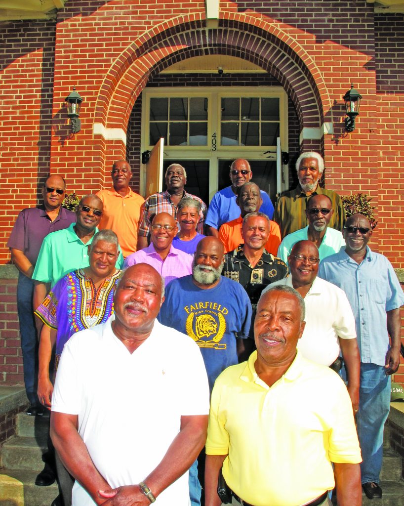 Alumni Association vice president Robert Davis (class of ‘66), front left, and president Don Prioleau (class of ‘62) and some of their former schoolmates stand in front of the school they attended and later helped restore to it’s original charm.