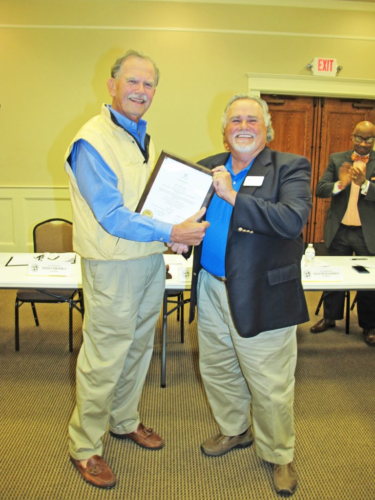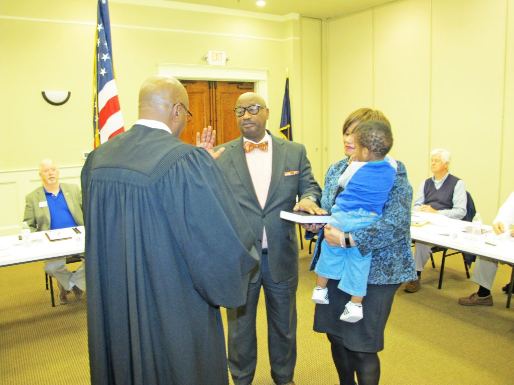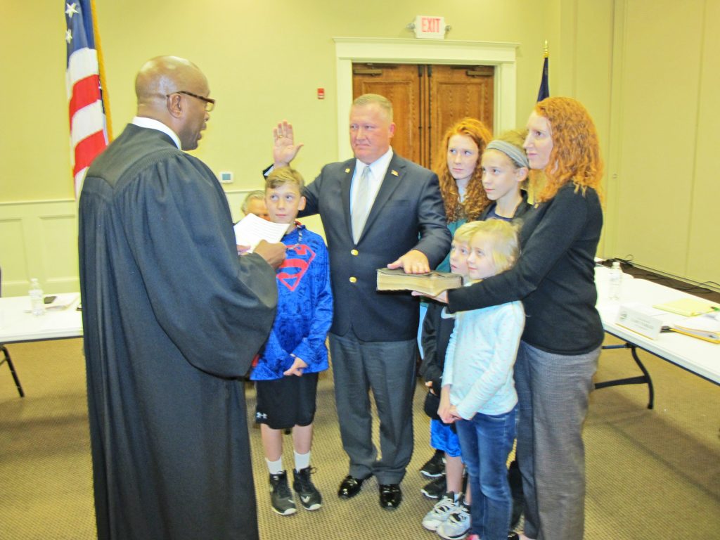 BLYTHEWOOD – Stepping down after four years helping guide the Town, Councilman Tom Utroska was bid farewell by the Mayor, his fellow Council members and many friends who attended the meeting. Next, Blythewood Magistrate Josef Robinson swore in Councilman Larry Griffin for a second term, assisted by his wife Leanora and their grandson, Jordan Frazier. At right, Judge Robinson administered the oath of office to new Councilman Brian Franklin, assisted by his wife Dusty, right, and five of their eight children.