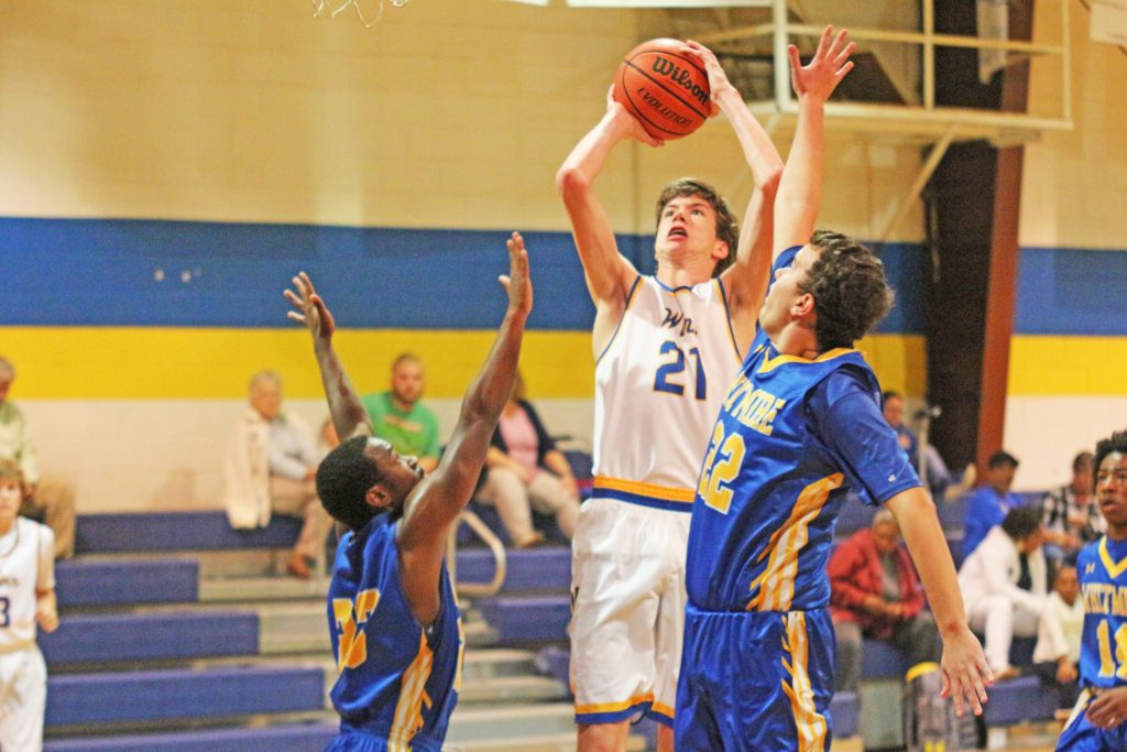 Hudson Wade (21) gets over the two Wolverines. He sunk a game winner against Thomas Sumter the next night. | Photo/Martha Ladd