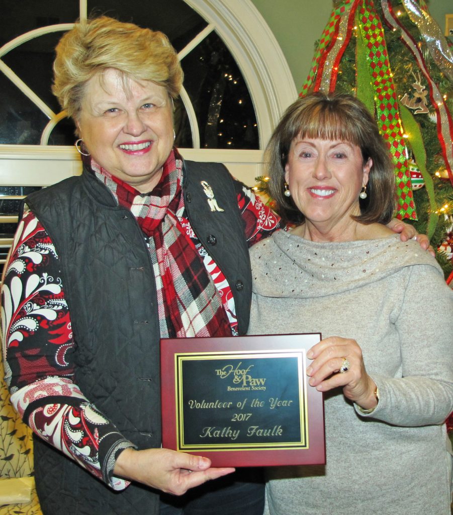 Deborah Richelle, left, president of the Hoof & Paw Benevolent Society Board, presents a plaque to Board member Kathy Faulk for being named the group’s first Volunteer of the Year.