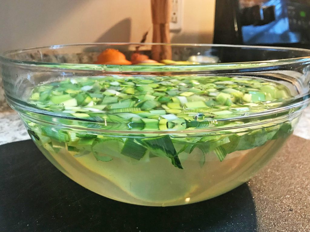 Step 6: Place the leeks in a big bowl, (taller bowls work better than shallow bowls) of tepid water and agitate the leeks until the layers have separated and the leeks appear clean. The sandy grit will fall to the bottom of the bowl. Skim off the clean leeks leaving the sandy water behind.