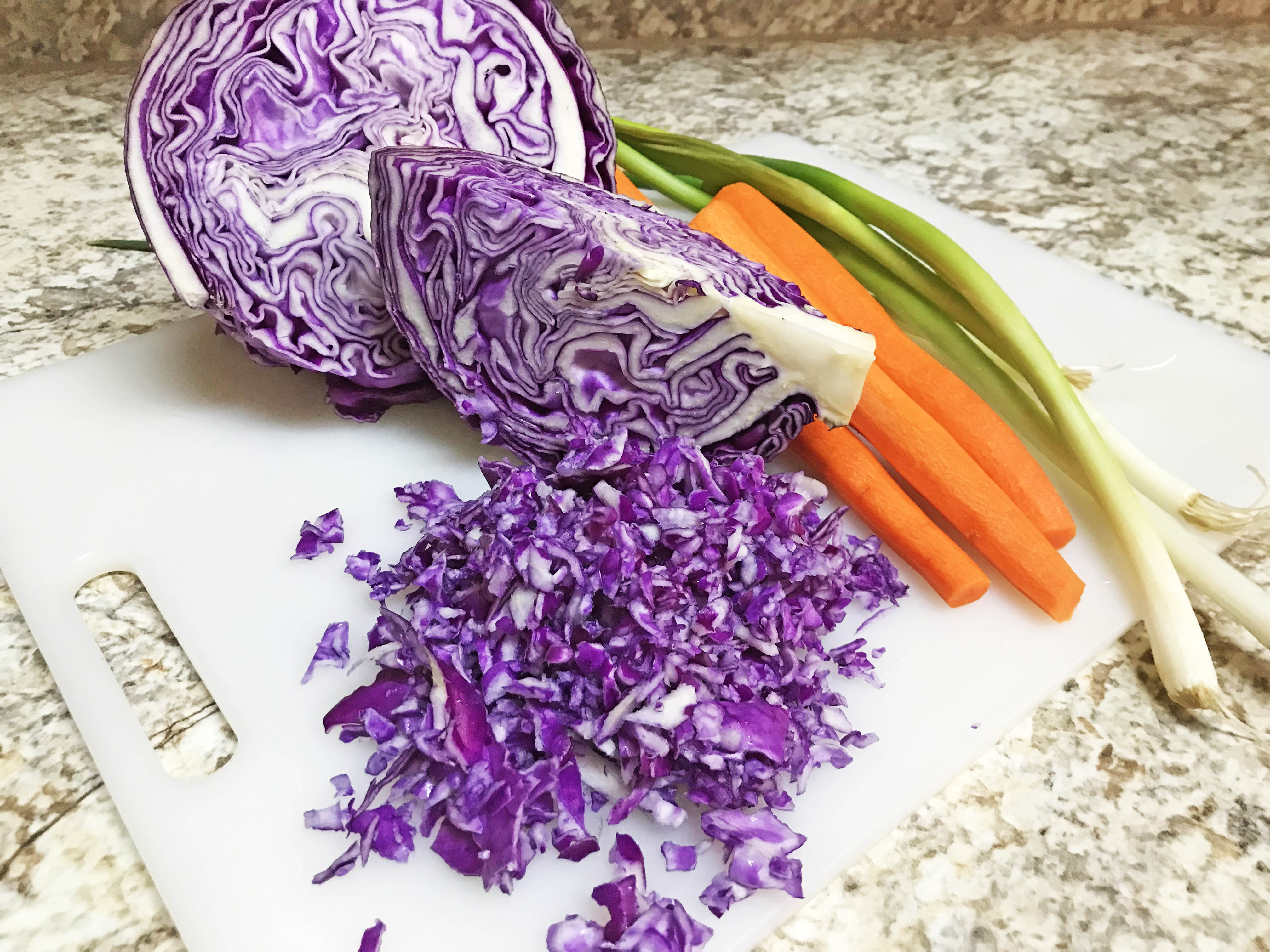 While red cabbage sports the name “red” it’s actually more purple than red, and as such, falls into the trendy purple veggie category. This powerful purple vegetable can boost the immune system as well as promote a healthy gut. Red cabbage has 10 times the amount of Vitamin A as green cabbage, so making slaw with red cabbage instead of green just makes sense. And just when you thought things couldn’t get healthier, we toss in some vibrant orange shredded carrots for a slaw recipe that is a true nutritional powerhouse.