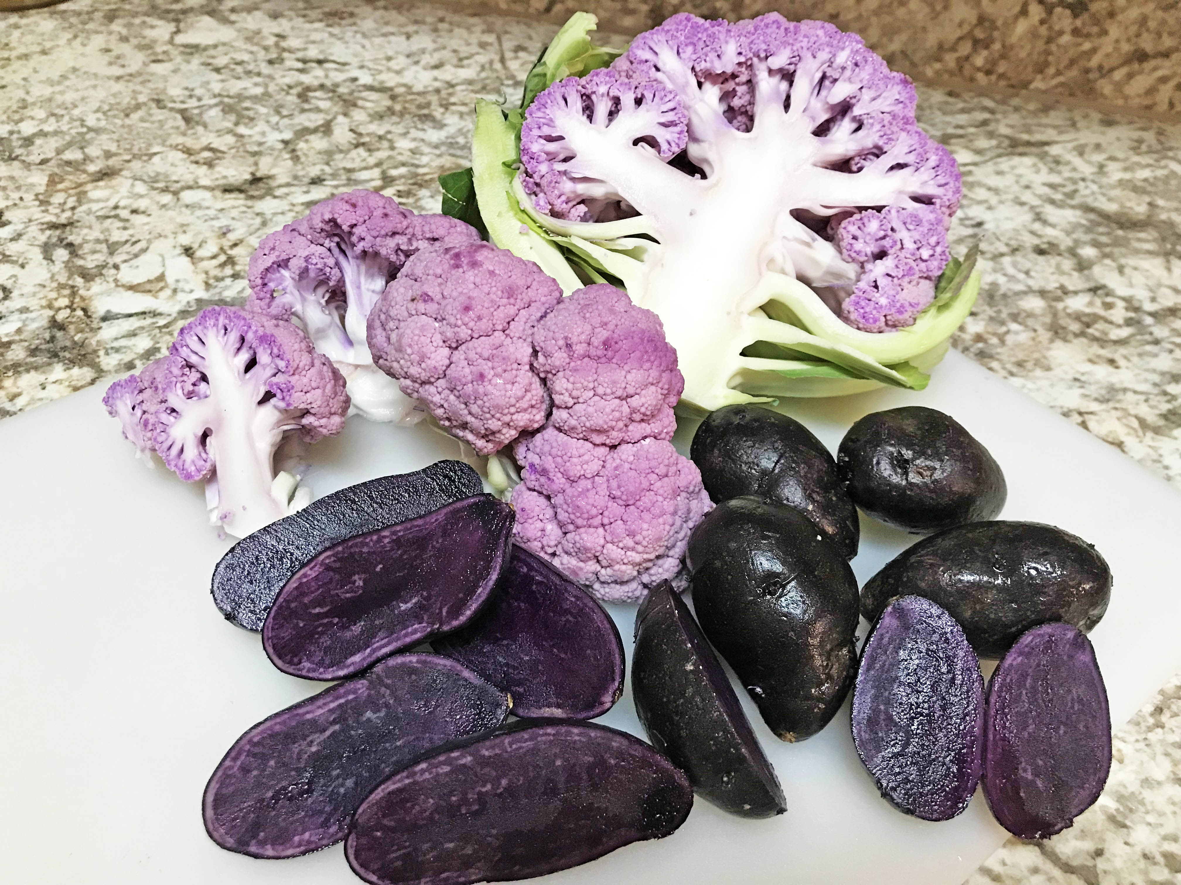 While you can’t go wrong roasting these vibrant beauties, I thought I’d branch out and try a purple potato and cauliflower soup.