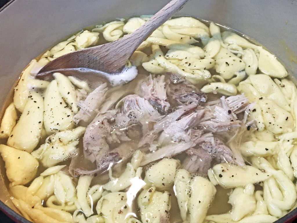 Transfer broth to a large Dutch oven and bring to a simmer. Squeeze about 1 inch of dumpling dough from piping bag, cut with a pair of kitchen shears or squeeze off the dumplings and let them fall into hot broth. Continue piping and snipping into hot broth until you have used all the dumpling dough.