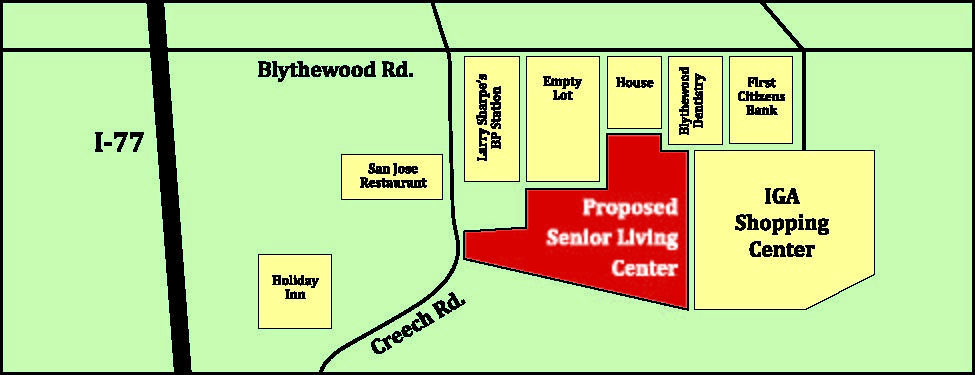 The facility, to be named Blythewood Senior Living, is proposed for a five-acre site on Creech Road between the Russell Jeffcoat offices and the IGA and behind Larry Sharpe’s BP service station and three other lots facing Blythewood Road.