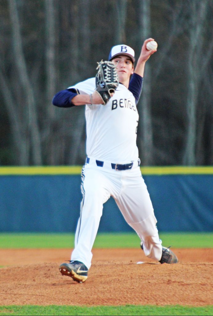 BLYTHEWOOD – John Lanier stays poised as he toes the mound in Tuesday night’s matchup against Dutch Fork. The Silver Foxes bested the Bengals 4-3.