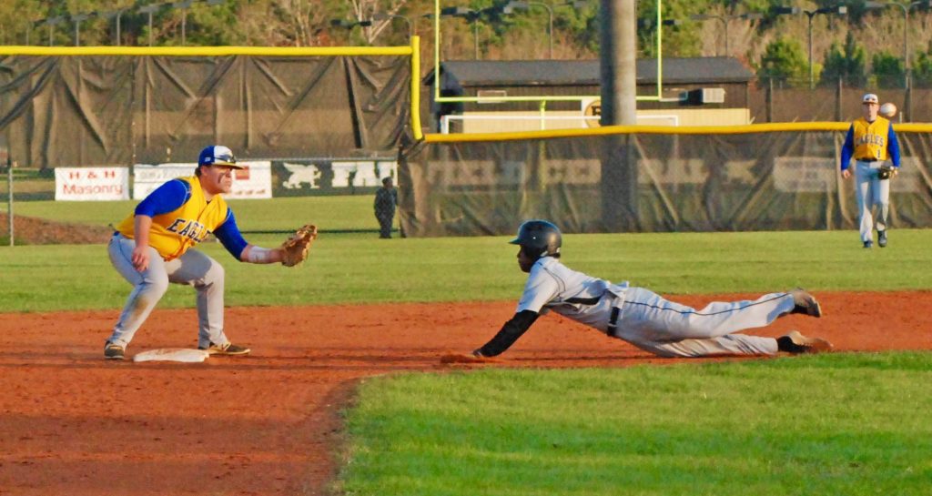 WINNSBORO – Griffin base-runner Chazi Jones looks to dodge the tag from Cameron Bass. Richard Winn put a decisive 13-1 throttling over their cross-town rivals.