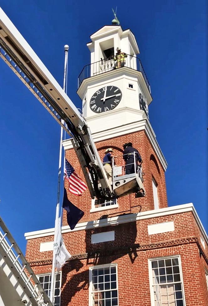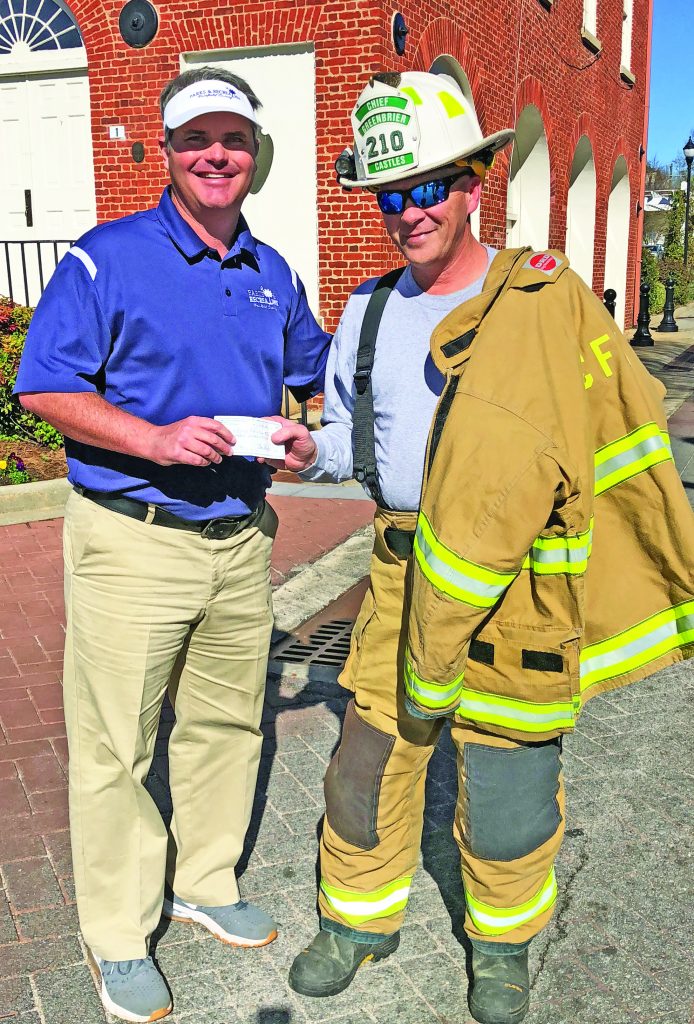 WINNSBORO – Fairfield County Recreation Director Russell Price and Deputy Fire Director Greg Gerber were lifted to the top of the Town Clock by a ladder truck to meet Greenbrier Fire Chief Sammie Castles, who gave a $300 donation from the Fairfield County fire chiefs to the Recreation Department. Price, pictured right with Castles, will use the donation to sponsor a youth baseball team at the Recreation Department this spring.