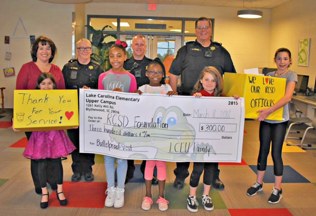BLYTHEWOOD – As a service learning project, student leaders at Lake Carolina Upper Campus presented a $300 check to the Richland County Sheriff’s Department Foundation and over 200 police officer survival kits.