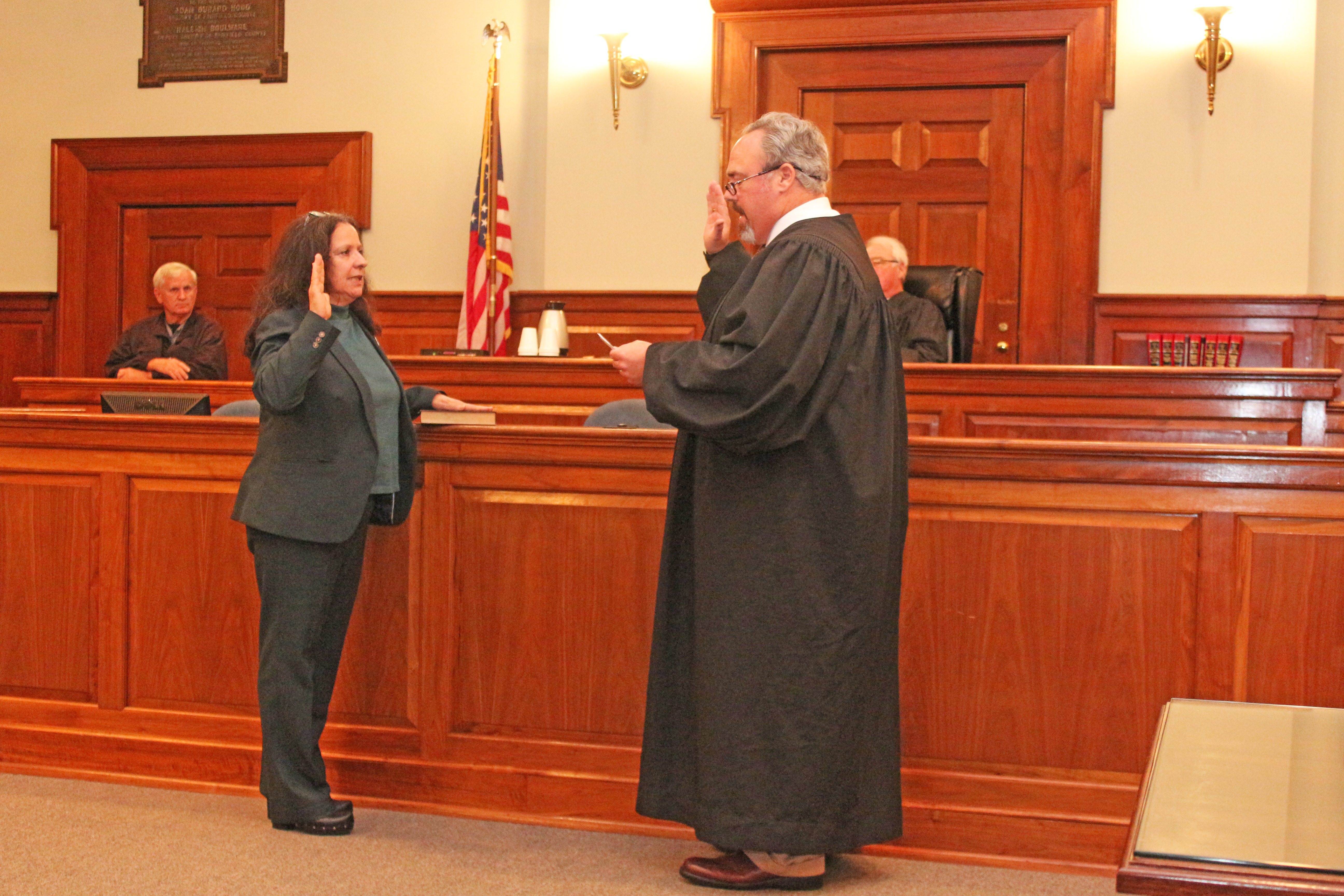 - Sixth Judicial Circuit Court Judge Brian Gibbons administers the oath of office to Family Court Judge Debra Matthews.