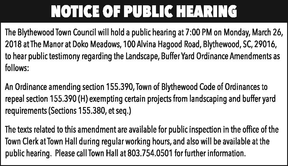Notice of Public Hearing: Blythewood Town Council, Landscape, Buffer Yard Ordinance