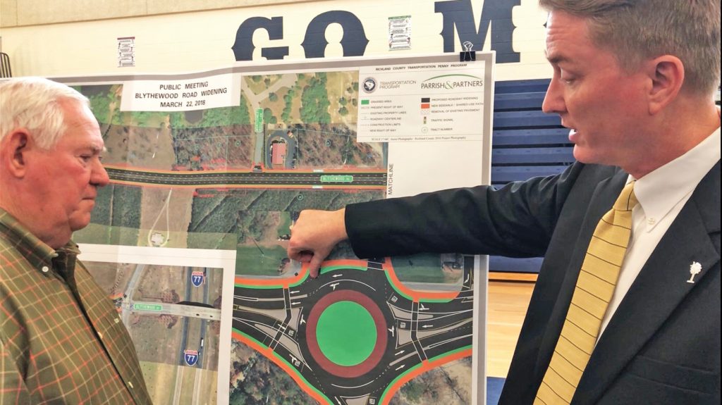BLYTHEWOOD –  As controversy heated up over a proposed traffic circle that would impact the Blythewood Road entrances to Cobblestone Park, Palmetto Citizens Bank, the Food Lion shopping complex and two properties owned by Blythewood businessman Larry Sharpe, Richland County Penny Tax officials took a step back this week to again receive citizen input on the issue. But, at the end of the day, David Bailey, one of several members of the county-hired program development team who met with citizens Thursday evening, was less than yielding.