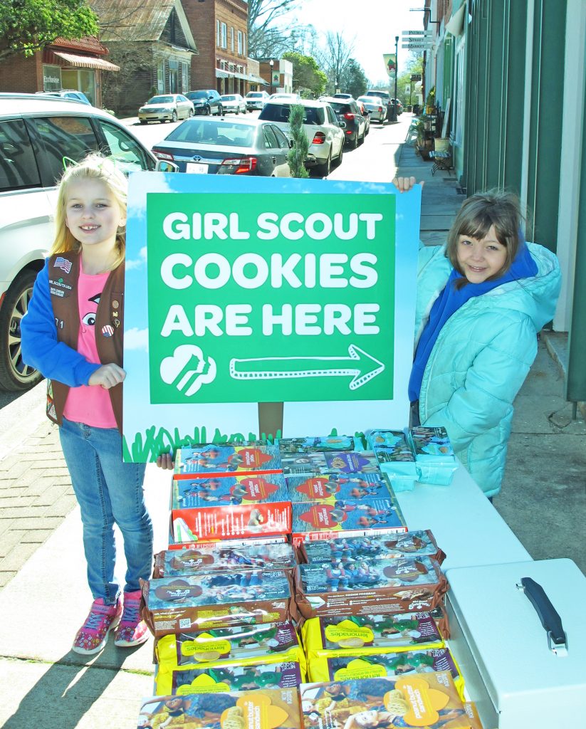 RIDGEWAY – Brownies Haley Autry, left, and Madalyn Stout set up shop in downtown Ridgeway Saturday to sell Girl Scout cookies. If you missed them before they sold out, you can still purchase the cookies by calling 803-206-5333. You can never eat too many Girl Scout cookies!