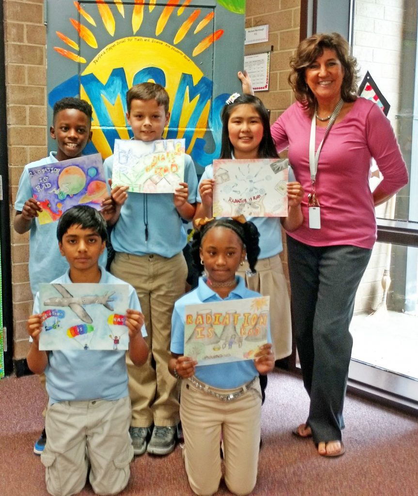 WINNSBORO – Kingston Belton, back left, Owen Wilson, Zielaika Curabo, Krishi Patel, Aaliyah Mayfield. Pictured with their teacher, Kimi Daly, from Fairfield Magnet School for Math and Science were state finalists in the Nuclear Power art contest.