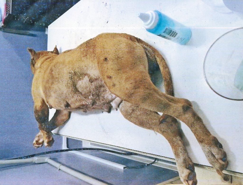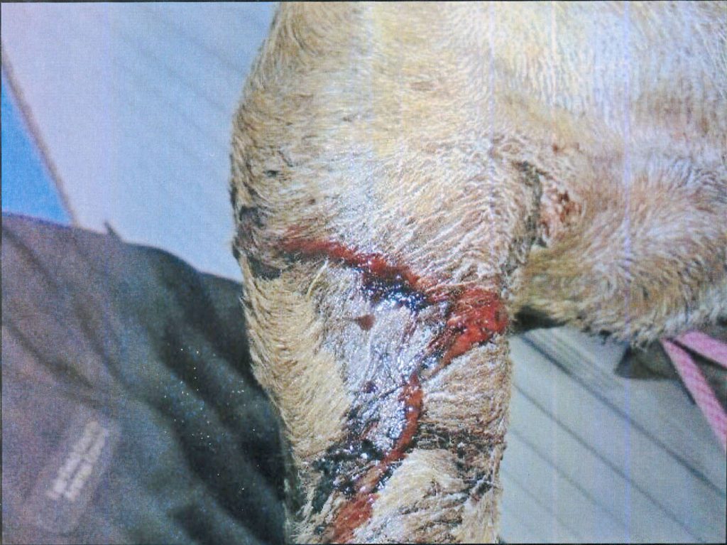 When animal control picked the dog up, the deputy said he observed brown liquid coming from a laceration on the back of the dog’s left leg.