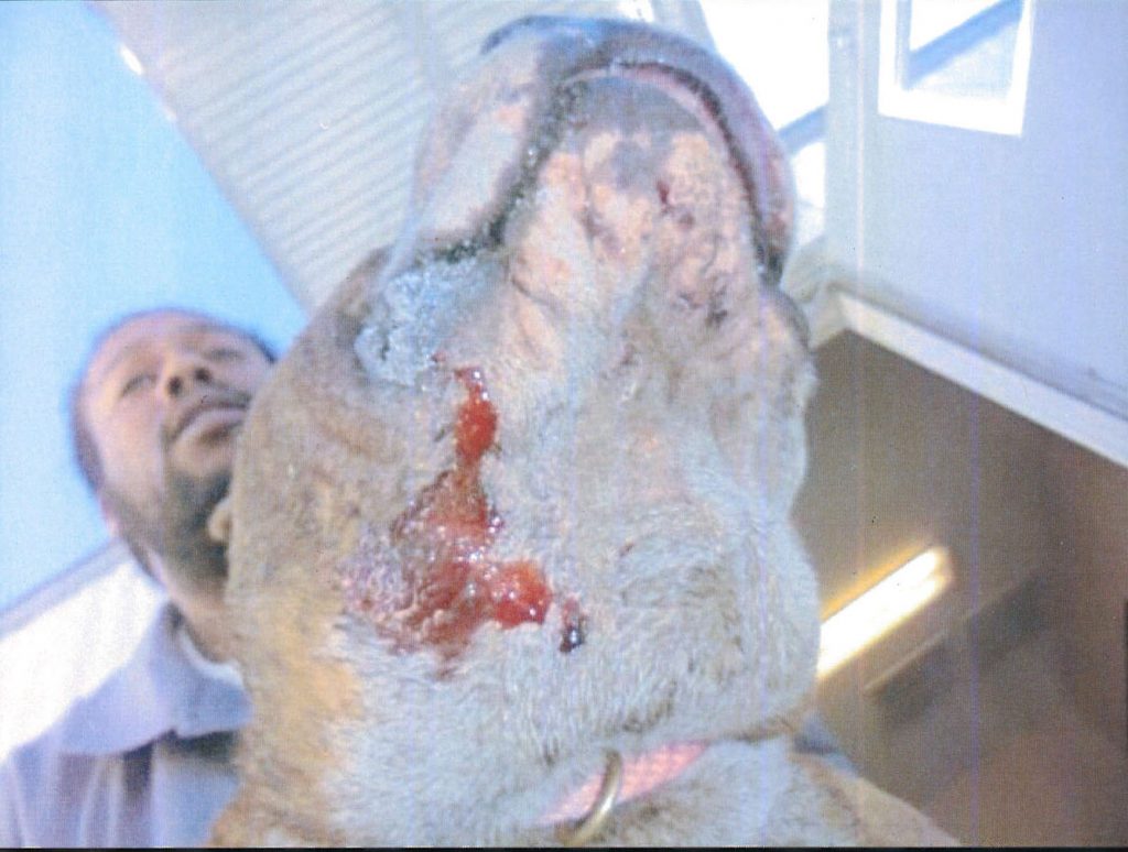 The deputy noticed a brown and white female pit bull lying on the ground behind a vehicle with several lacerations and dried blood on her leg, blood dripping from under her neck and blood mixed with saliva dripping from the dog’s mouth. The report stated that the dog could not move.