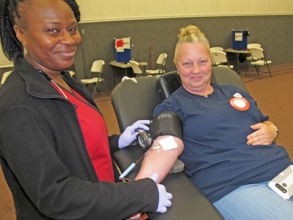 WINNSBORO – Red Cross phlebotomist Mickey Grant, left, assists Leigh Gambrell during the Boots and Badges blood donation competition Saturday at the Winnsboro Church of the Nazarene. The Sheriff’s Department slid past the Fairfield County Fire Department to take the win in the friendly competition.