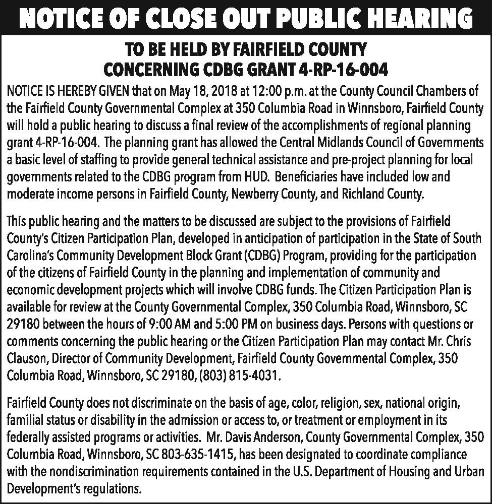 NOTICE OF CLOSE OUT PUBLIC HEARING – CDBG Grant 4-RP-16-004
