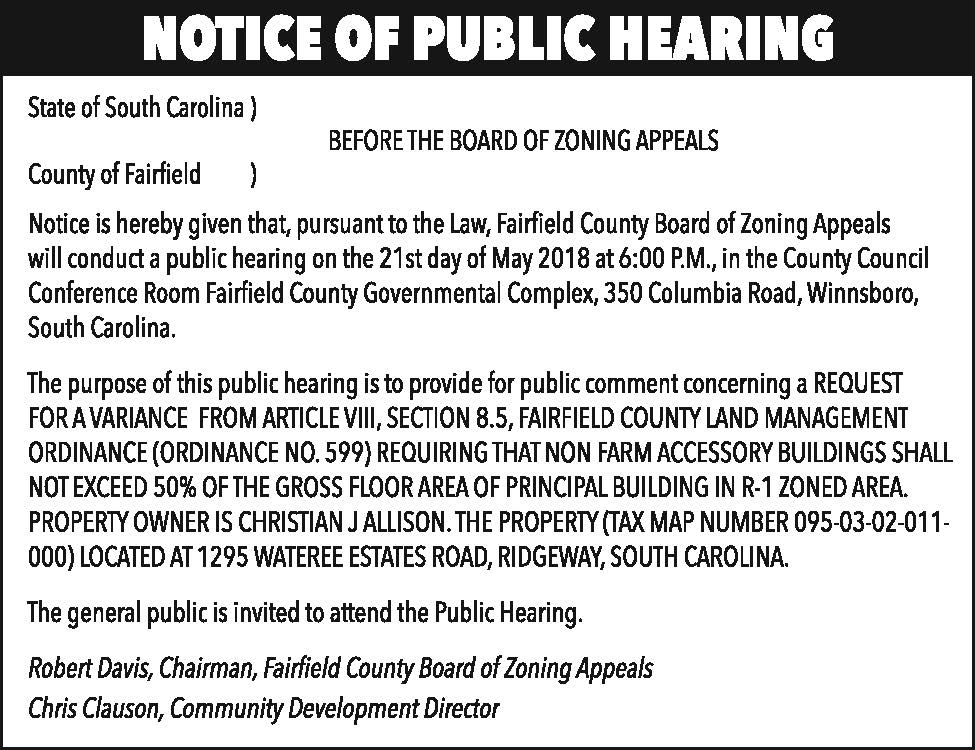 Notice of Public Hearing – Fairfield County Board of Zoning Appeals