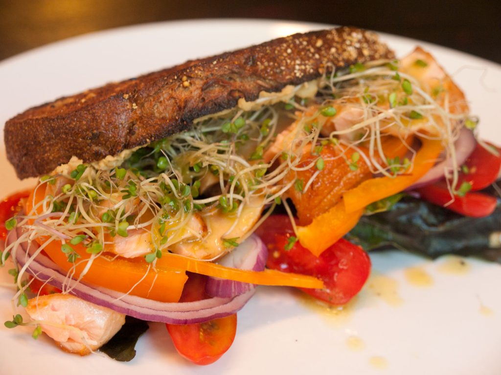 After the bread is cooled a bit, spread each slice with a tablespoon of hummus. Layer the lettuce, tomato, red onion, pepper, other vegetables and grilled meat on one slice of bread. Add a handful of sprouts and douse with Lemon Vinaigrette. Top with the remaining toast slice. You may need a knife and fork for this one!