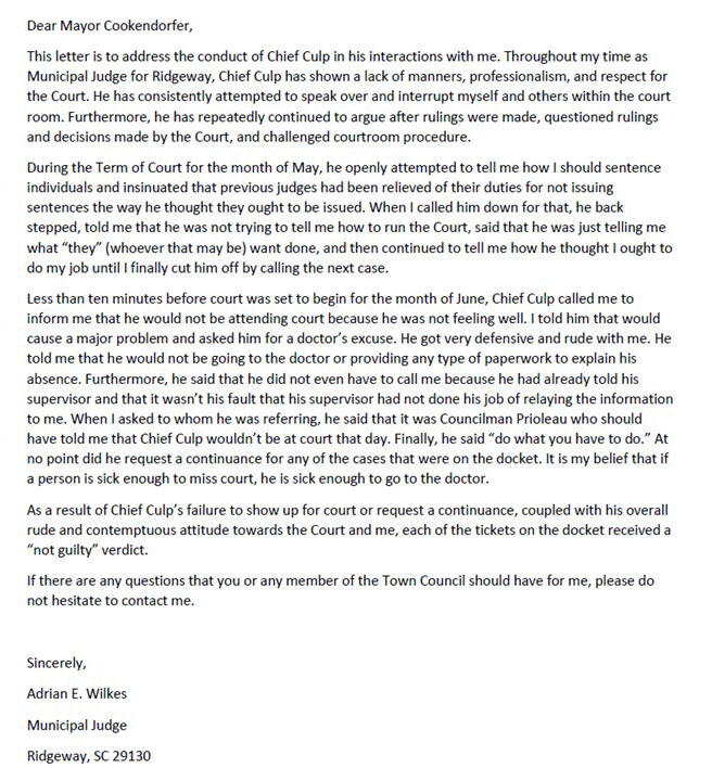 Judge Adrian Wilkes’s letter of complaint to Mayor Heath Cookendorfer concerning Ridgeway Police Chief Christopher Culp.