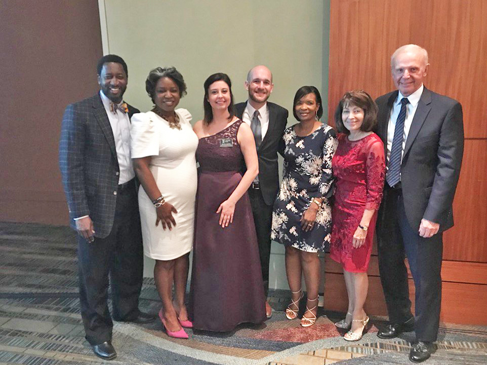 WINNSBORO – Brooke Alberson, fourth grade teacher at Fairfield Magnet School for Math and Science, was named Fairfield County School District Teacher of the Year. Alberson, pictured third from left, was honored at the State Teacher of The Year Banquet with FCSD Superintendent Dr. J.R. Green, left, Tonya Green, Alberson, Trent Erving, Stephanie Fanning, Dr. Sue Rex and Dr. Jim Rex, former SC Superintendent of Education.