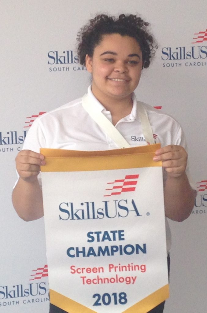 COLUMBIA – Fairfield Career and Technology Center student Aeriel Truesdale placed first in the Skills USA State Screen Printing contest at Midlands Technical College on March 9. Truesdale, a graphic communications student, will compete in the National Competition in Louisville, Kentucky on June 29 with her instructor Marvin Miller. Skills USA, a student organization for trades and skills students, is the second largest student organization in the US.